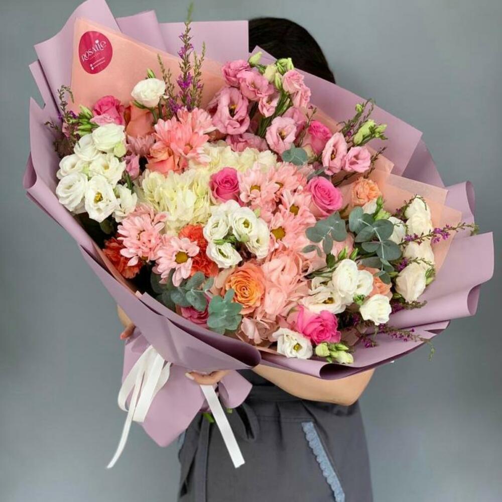 Альстромерии, Гортензии, Кустовые розы, Лизиантусы, Розы, Хризантемы