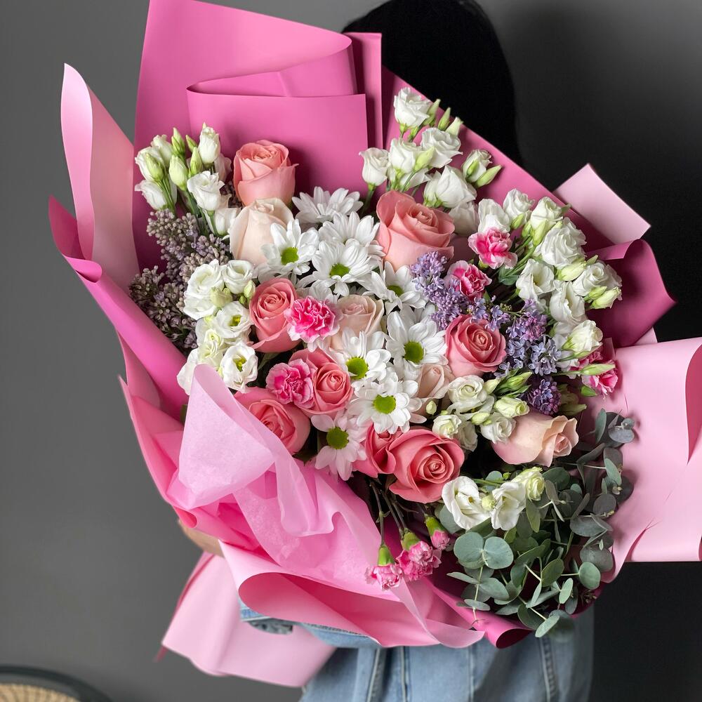 Альстромерии, Гвоздики, Кустовые розы, Лизиантусы, Розы, Хризантемы