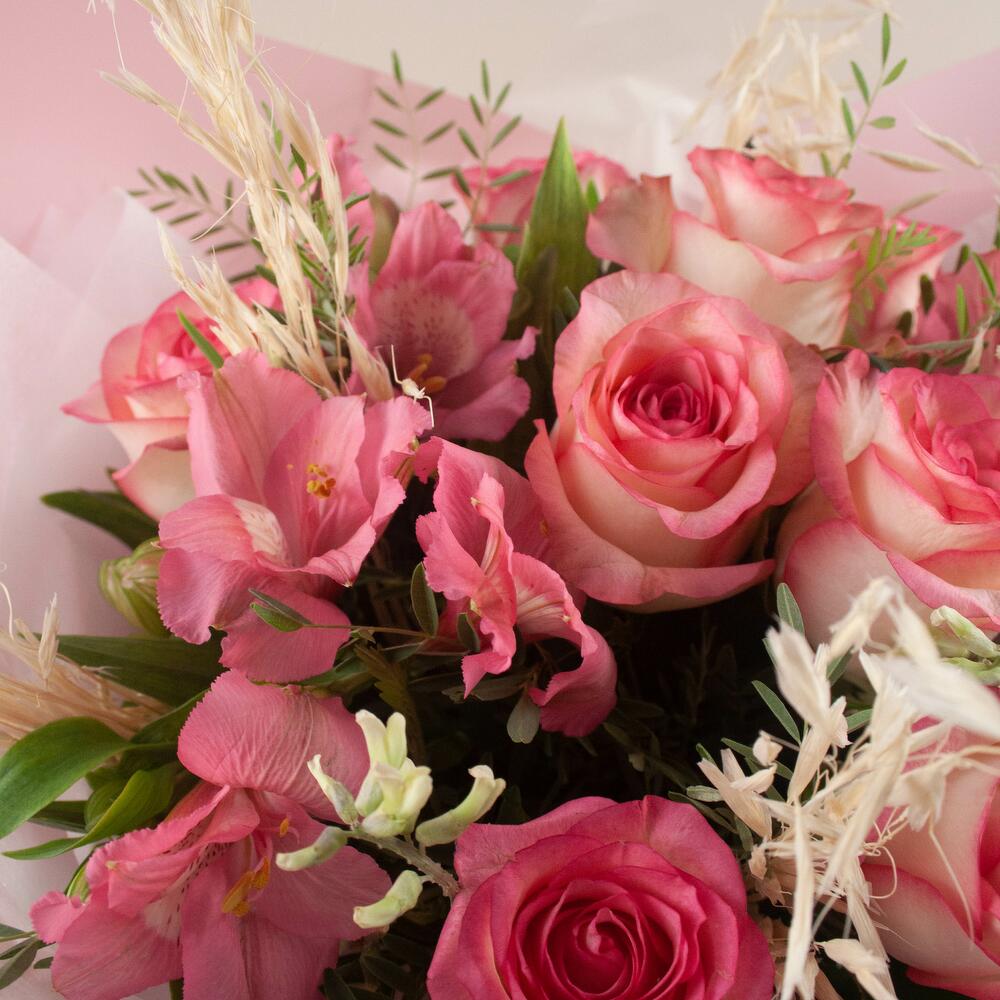Роза – 9 шт. Альстромерия – 3 шт. Овес – 1 шт. Оформление – 1 шт.