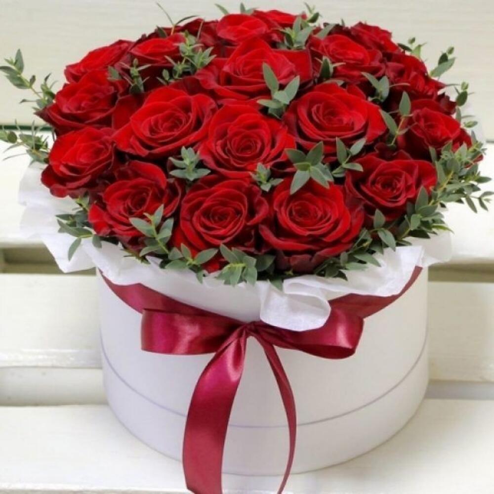 Лента – 2 шт. Эвкалипт – 4 шт. Роза – 25 шт. Коробка шляпная – 1 шт. Оазис – 2 шт.