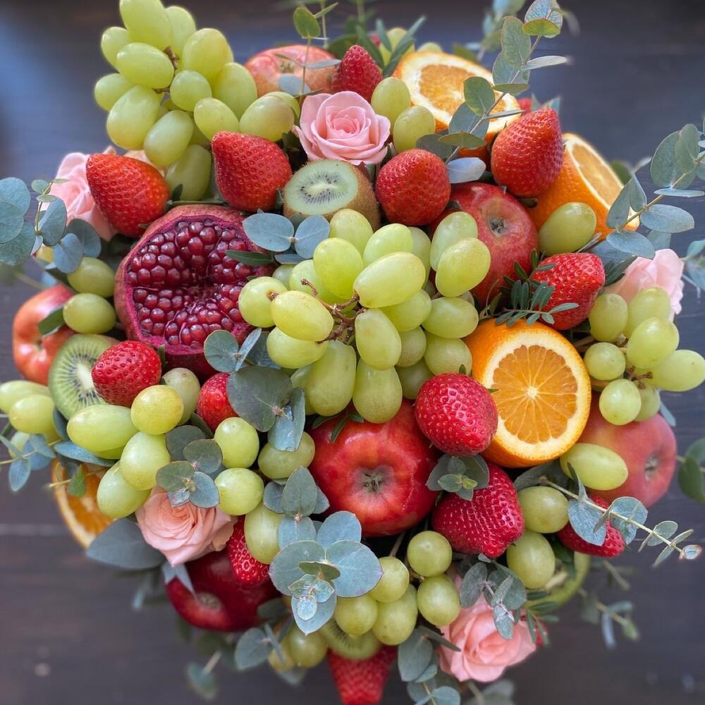 гранат красный – 1 шт.яблоко красное – 5 шт.Апельсин – 5 шт.Виноград гроздь – 5 шт.Клубника – 20 шт.Киви – 7 шт.Эвкалипт – 5 шт.Коробка шляпная – 1 шт.Роза кустовая – 4 шт.