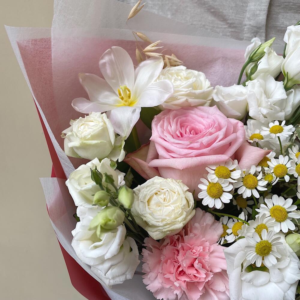 Категорий: Гвоздики, Кустовые розы, Лизиантусы, Розы, Ромашки, Тюльпаны