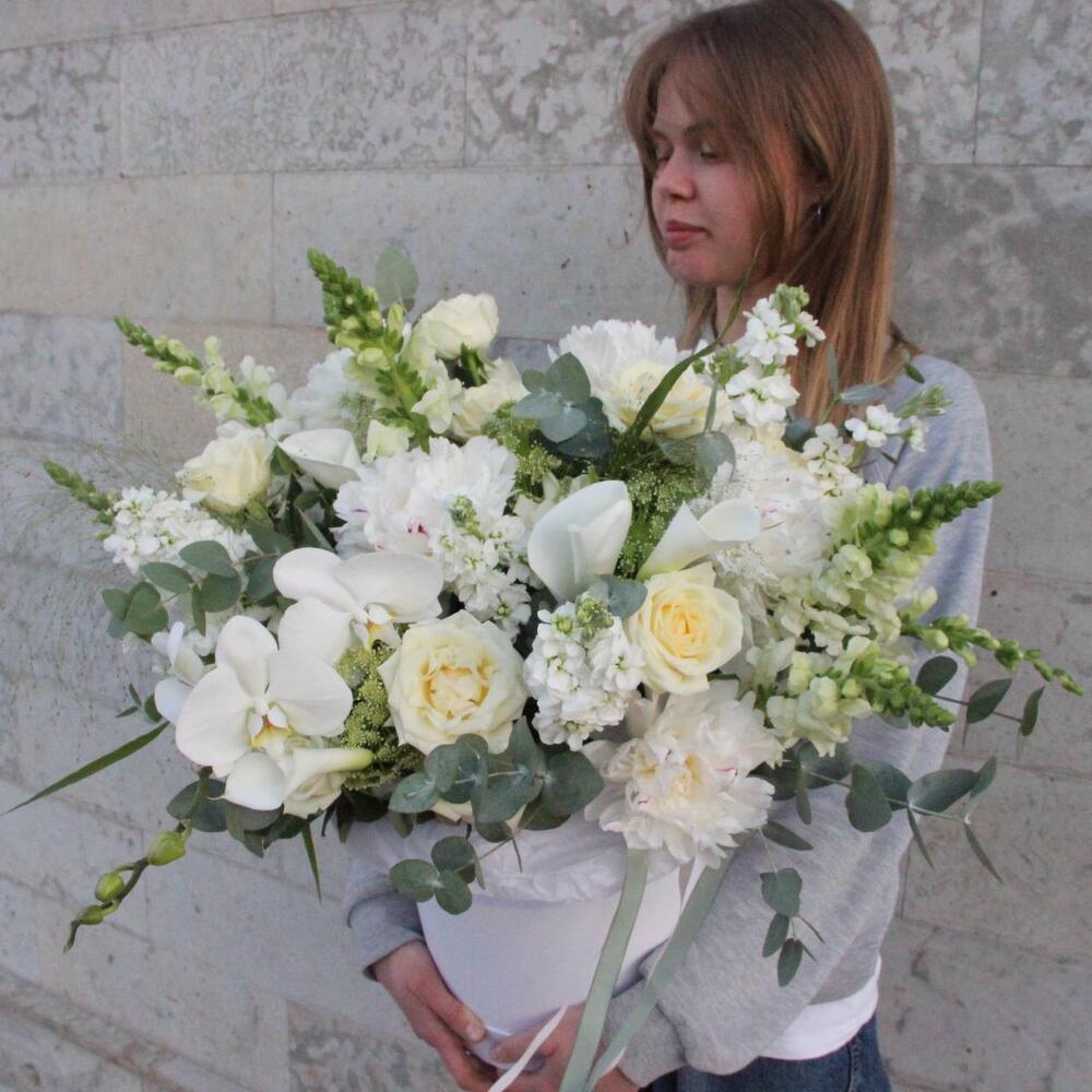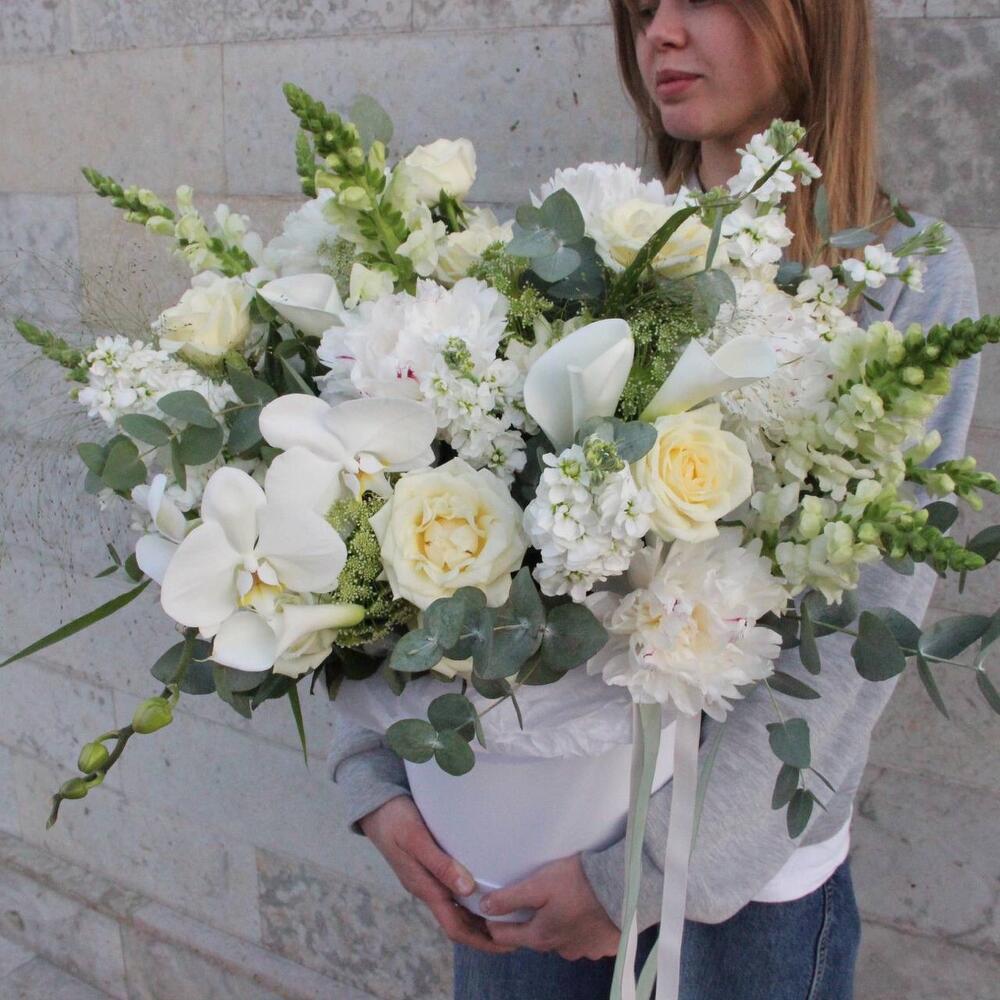 орхидея – 2 шт.Сирень – 5 шт.Роза – 9 шт.Львиный зев – 7 шт.Маттиола – 7 шт.Амми – 5 шт.Лизиантус – 4 шт.Паникум – 4 шт.Эвкалипт – 11 шт.Коробка шляпная – 1 шт.ленты атласные – 2 шт.