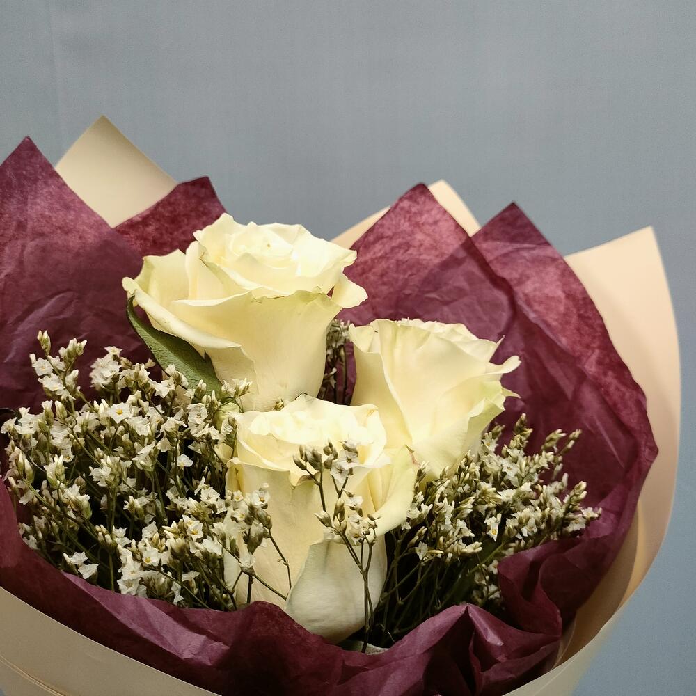 Лимониум – 2 шт.Тишью – 1 шт.Роза Эквадор белая – 3 шт.Пленка матовая – 1 шт.
