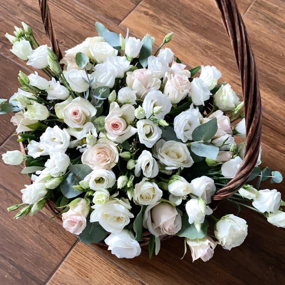 Корзина из роз и лизиантуса с эвкалиптом
