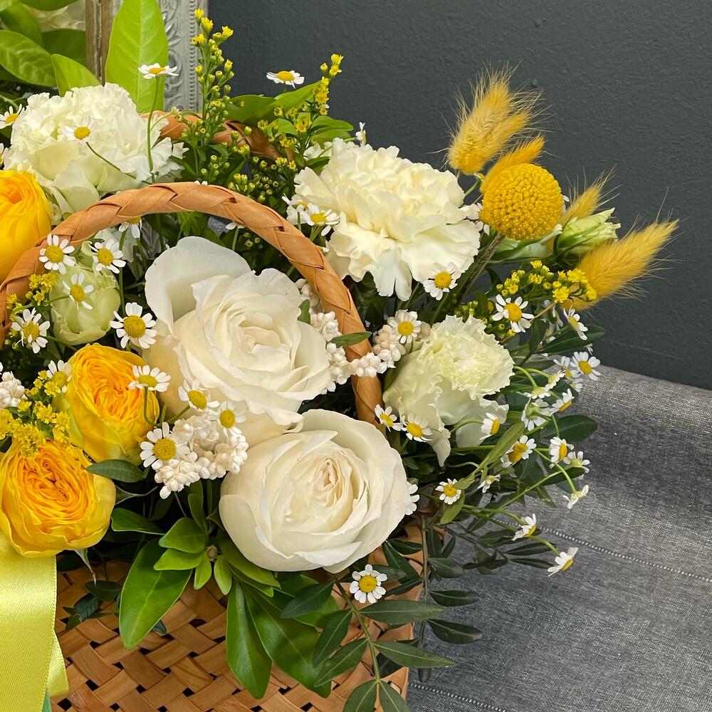 Роза одноголовая – 3 шт.Роза кустовая пионовидная – 1 шт.Гвоздика сортовая – 4 шт.Матрикария – 1 шт.Солидаго – 1 шт.Лагурус – 9 шт.Чойсия – 1 шт.Корзина плетеная – 1 шт.Оазис флористический – 1 шт.Лента – 2 шт.Краспедия – 1 шт.Лизиантус – 1 шт.