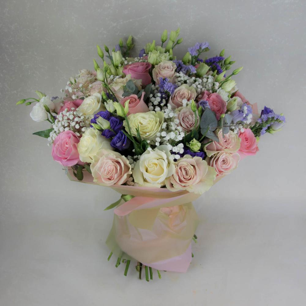 Смешанный букет из роз и гипсофилы и других цветов. Приблизительный размер 55×60.