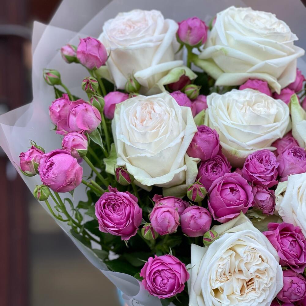 кустовая пионовидная роза misty bubbles – 7 шт.пионовидная роза white o’hara – 9 шт.Авторская упаковка – 1 шт.