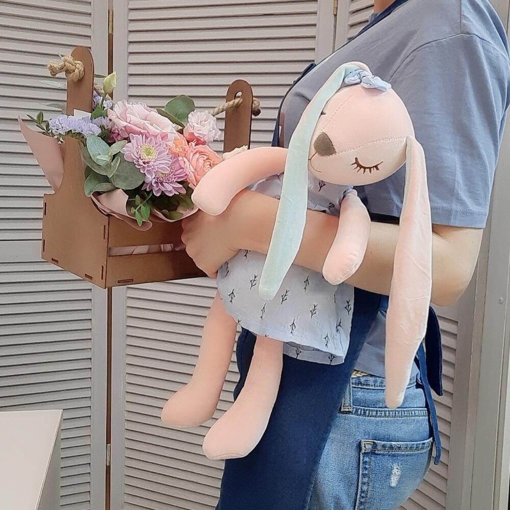 Статица – 1 шт.Хризантема кустовая – 1 шт.Эустома – 1 шт.Роза пионовидная кустовая – 1 шт.Ящик деревянный подарочный – 1 шт.Губка флористическая – 1 шт.зелень декоративная – 7 шт.зайка плюшевый 45 см – 1 шт.