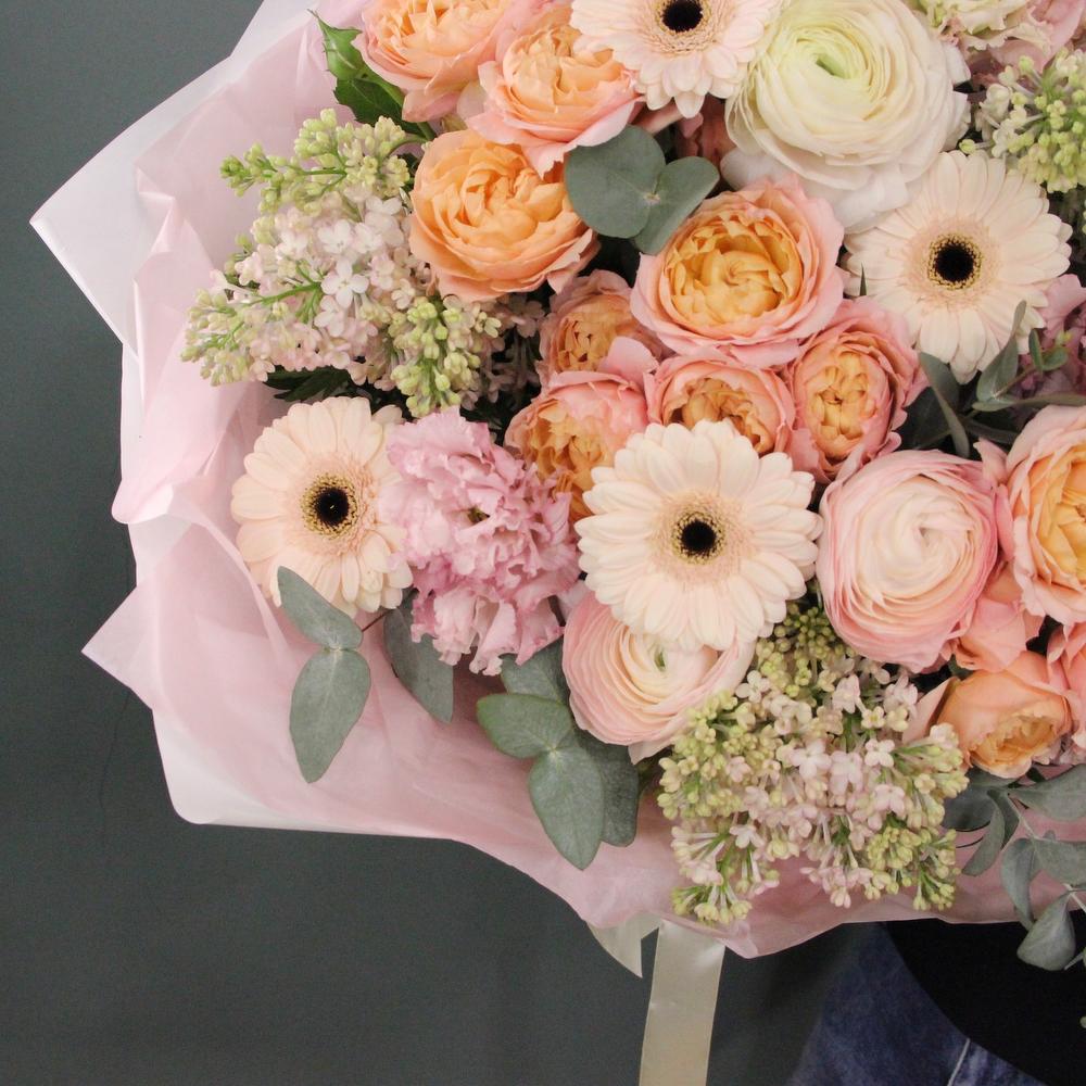 Лизиантус – 3 шт.Гербера – 5 шт.Роза кустовая пионовидная – 4 шт.Эвкалипт – 9 шт.Упаковка дизайнерская – 2 шт.Пион – 5 шт.Упаковка – 1 шт.Ранункулюс – 5 шт.