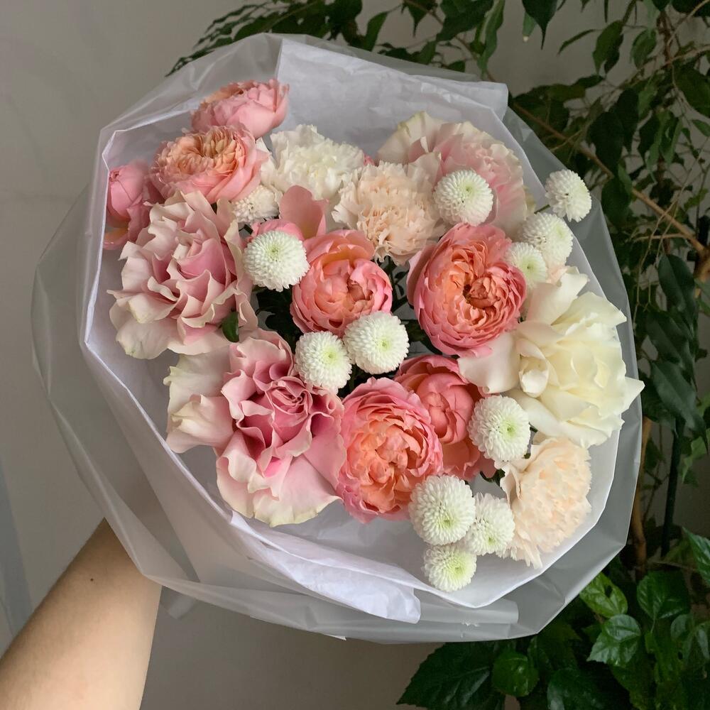 Гвоздика кремовая – 3 шт.Лента атласная – 1 шт.Упаковка дизайнерская – 2 шт.Кризал (подкормка) – 1 шт.Аквапак – 1 шт.Транспортировочная коробка – 1 шт.Роза pink mondial – 3 шт.Роза кустовая julliette – 2 шт.гвоздика белая сортовая – 1 шт.хризантема coconut – 3 шт.инструкция по уходу за цветами – 1 шт.роза playa blanca – 1 шт.