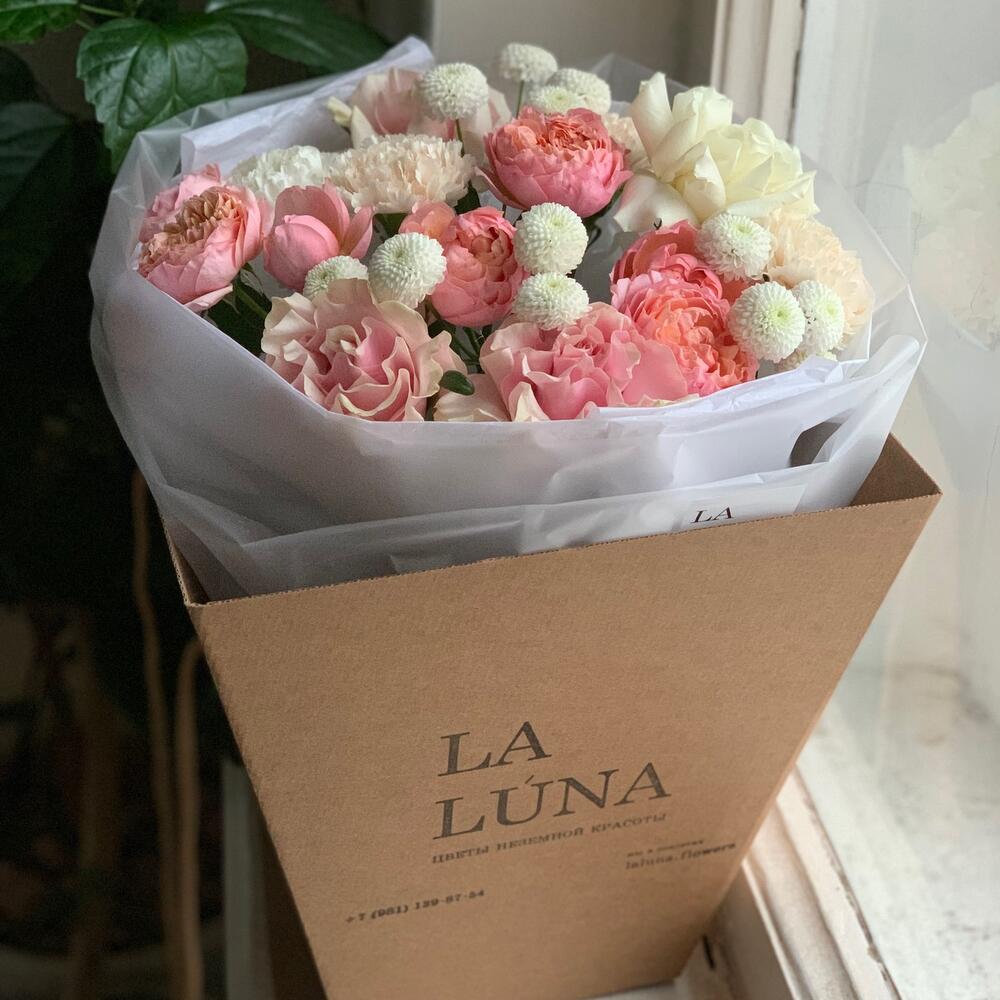 Кулек в стильной упаковке с вывернутыми и пионовидными розами в составе