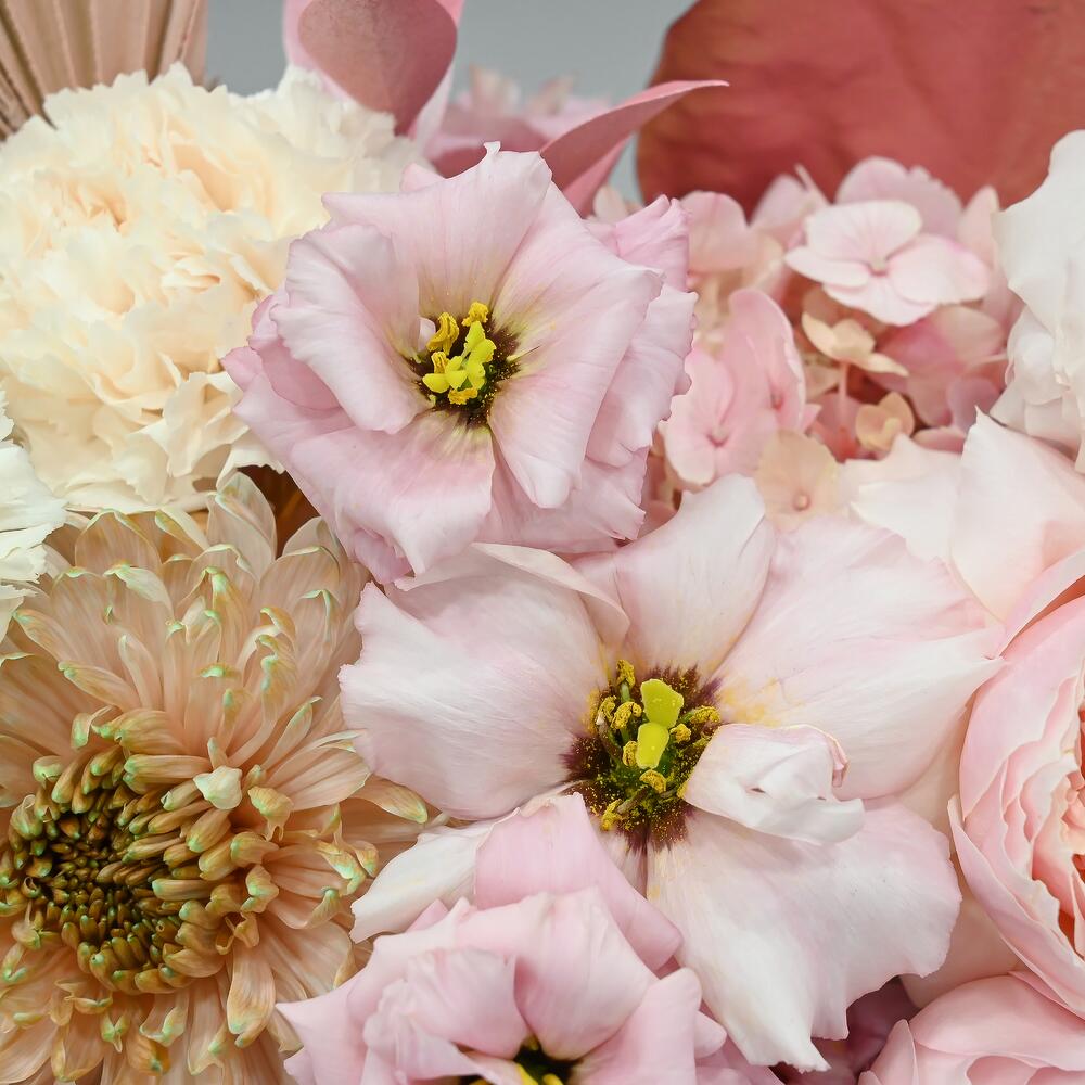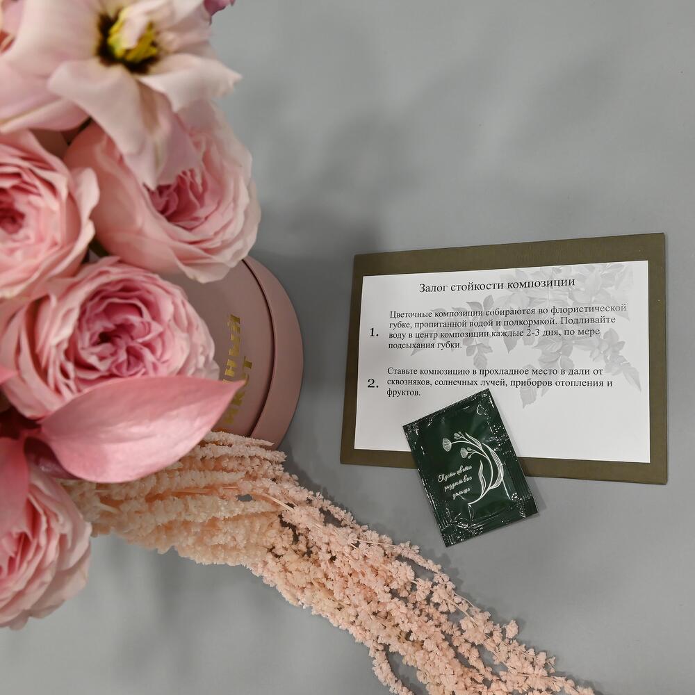 Нежная композиция в розовой цветовой гамме.В составе французские пионовидные розы, листья магнолии, кустовая пионовидная роза, похожая на пион, лизиантус, одноголовая хризантема и сортовая гвоздика.Флористы студии Цветочный Этикет собрали её из самых свежих цветов, тщательно … Показать ещёпродумав состав. Композиция готова удивлять красотой своего получателя! С композицией вы получите конверт с открыткой, в которой мы напишем любое пожелание, инструкцию свежести и средство для продления жизни срезанных цветов.
