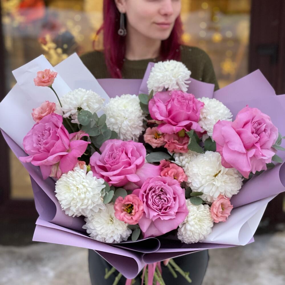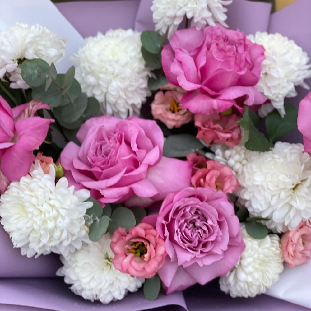 Альстромерии, Гвоздики, Кустовые розы, Лизиантусы, Розы, Хризантемы