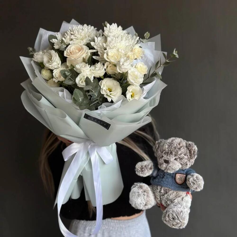 Прекрасный сет. Букет из роз, лизиантусов, хризантем и эвкалипта в компании милого мишки.