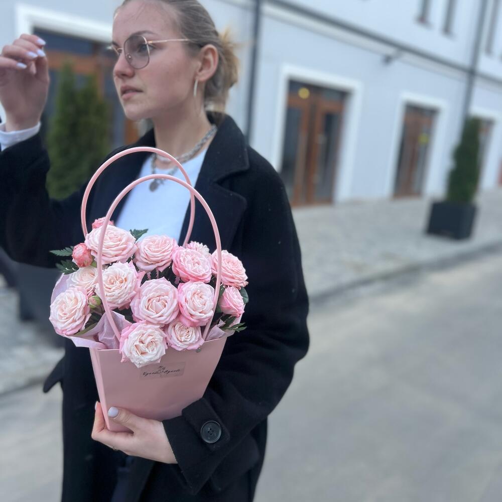 Роза кустовая Бомбастик – 4 шт.Тишью – 2 шт.Оазис флористический – 1 шт.сумочка с ручками – 1 шт.