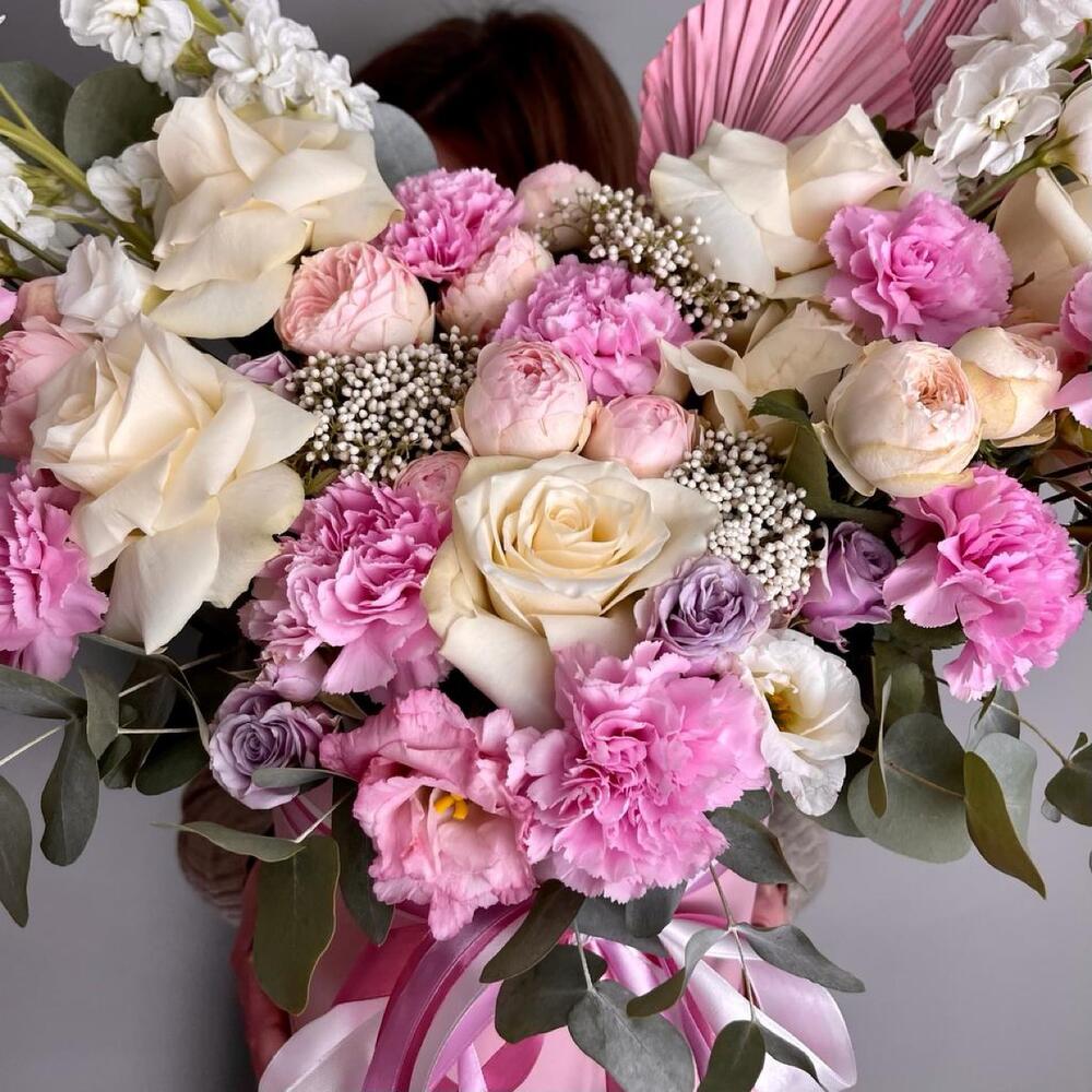 Маттиола – 4 шт.Лизиантус – 4 шт.Роза пионовидная кустовая – 5 шт.Роза – 5 шт.Озотамнус – 3 шт.Эвкалипт – 2 шт.Диантус – 9 шт.Роза кустовая – 1 шт.Лист пальмы – 2 шт.Оазис – 2 шт.Коробка шляпная – 1 шт.