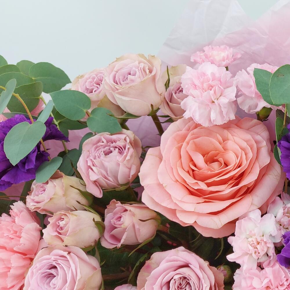 Нежный, ароматный, стильный букет в розово-сиреневых тонах. Такой букет всегда уместен и подойдёт для любого повода: День Рождения, именины, годовщина свадьбы, рождение ребенка, 8 марта, День Святого Валентина, выпускной и т.д. Можно вручить маме, сестре, подруге, коллеге, учителю, любимой.